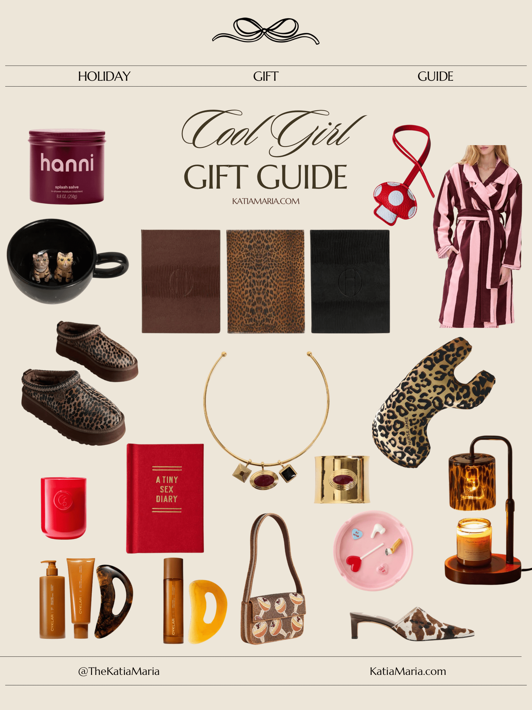Holiday Gift Guide 2025: Cool Girl Gift Guide splash salve in-shower body moisture treatment / custom pet ceramic mug / textured book box bundle / bag charm / robe / platform slippers / choker / cuff / pillowcase / candle / diary / ashtray / candle warmer / rituals set / glow set / beaded purse / heels Gift GuideKatia MariaNovember 14, 2025holiday gift guide 2025, gift guide 2025, gifts for cool girls, cool girl gift guide, holiday gifts, holiday gifts 2025Comment Facebook0 Twitter Pinterest0 0 Likes
